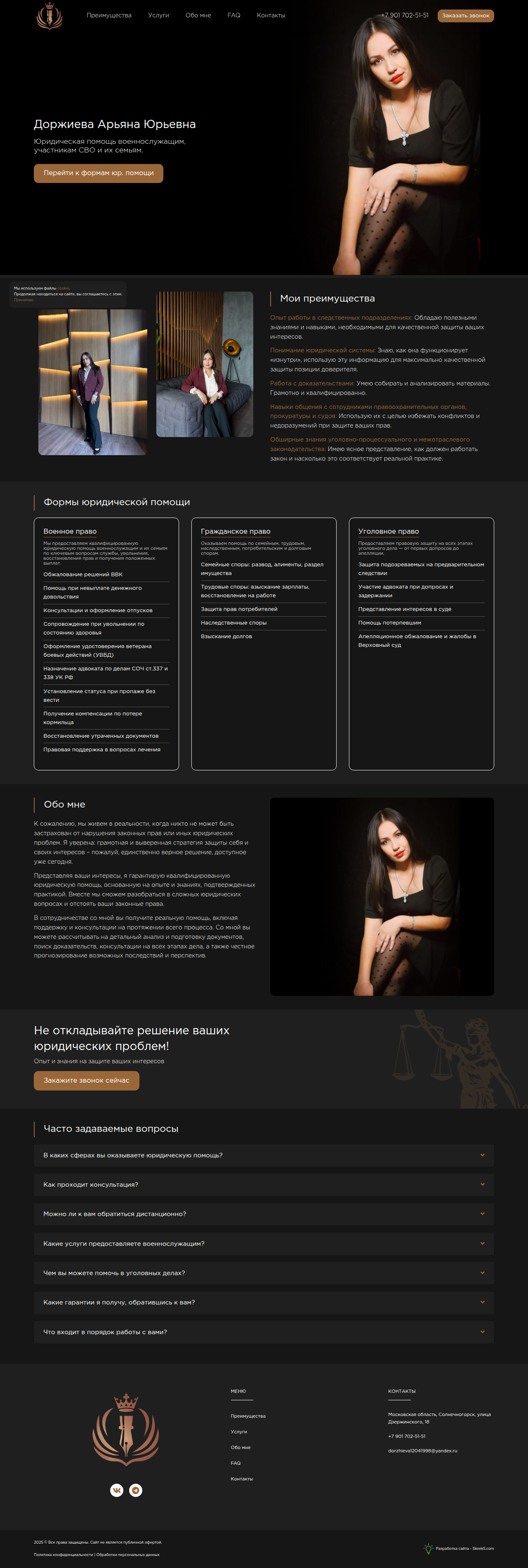 Создать представительный, удобный и доверительный сайт для адвоката (юриста), специализирующегося на помощи военнослужащим, участникам СВО и их семьям, а также на гражданско-правовых и уголовных делах. Основная задача — подача информации так, чтобы потенциальный клиент сразу понял, чем может помочь юрист, как связаться, и почувствовал профессионализм.